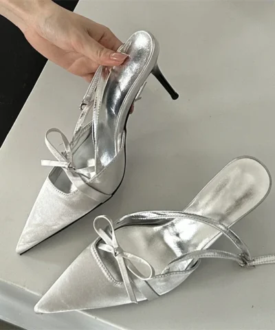 2024 Satin Solid Color High Heel Sandals Sexy Strap 7cm Slim Heel Sandals Bow Pointed Fashion Birthday Party Women’s Shoes 34-39