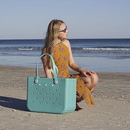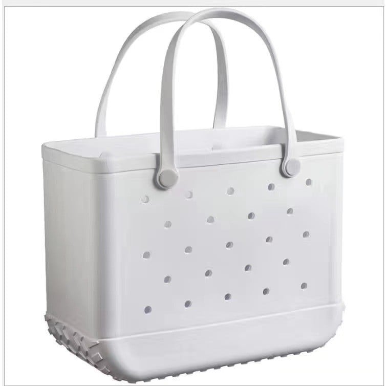 - OVERSIZED CARRY BAG:Large size 48 x 34 x 25 cm. The EVA tote bag is oversized and lightweight, roomy enough to hold tons of towels for snacks, sunscreen, body lotion, flip flops and more. This rubber beach bag can hold all the items you need for any scenario, e.g. For fitness, camping, beach games and swimming.