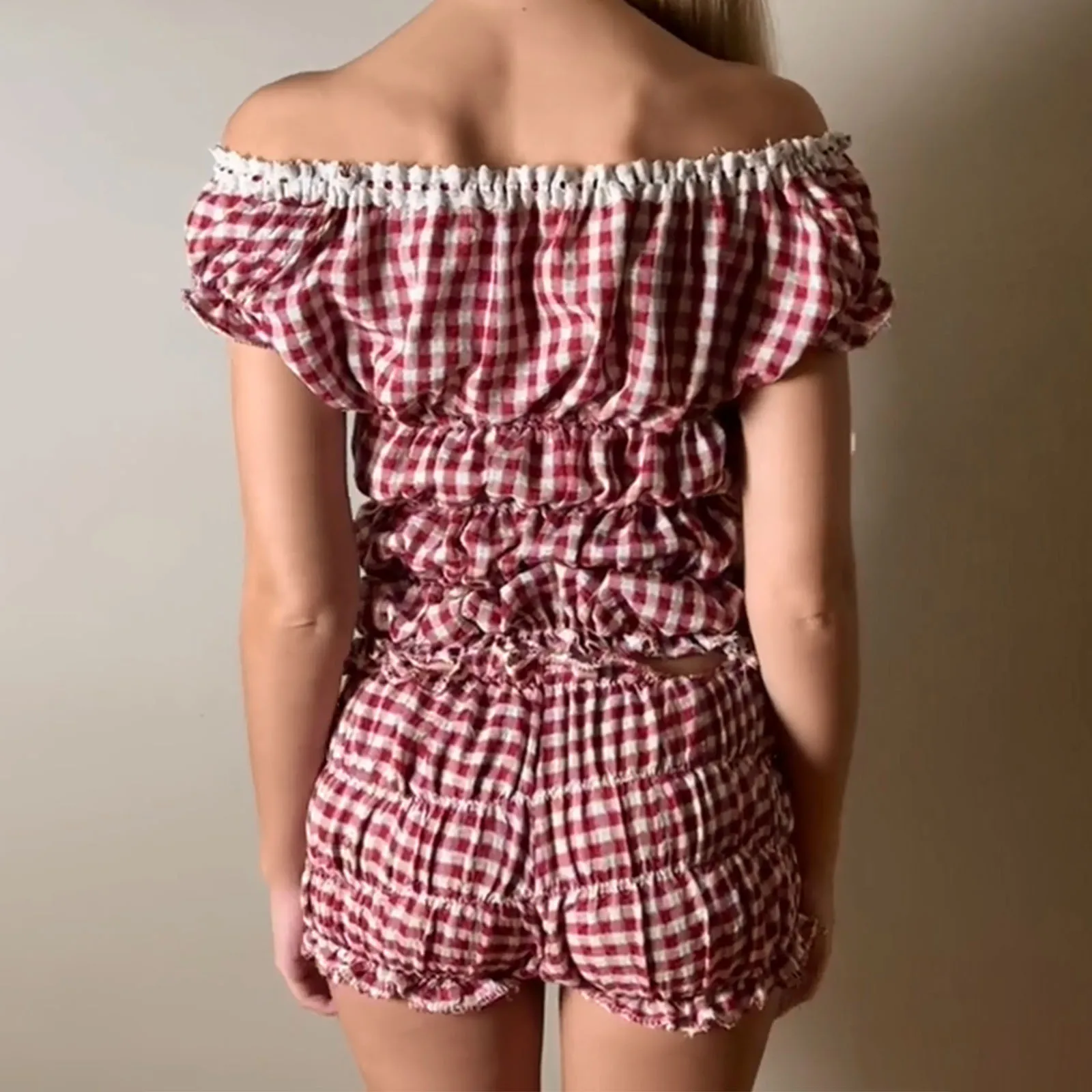 Women’s Summer 2 Piece Outfits Short Sleeve Ruched Tops Solid Color/Plaid Shorts Set